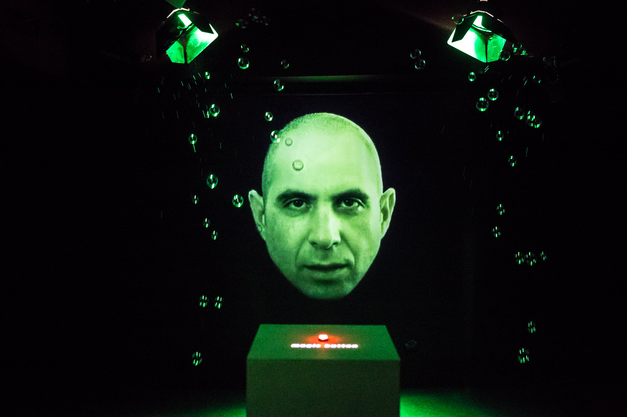 In initiating an encounter between works by Radić and Fishkin, the exhibition relates these two strong artistic personalities to enable a dialogue between their practices as well as an interaction with the space of exhibition and the attention and participation of the audience. Fishkin’s practice is concerned with immateriality and ephemerality, and, as described by curator Inke Arns, his installations produce the metaphysical, making it temporarily visible. Radić’s focus is the study of the complex layers of communication, explored through movement, gesture, and verbal expression. Her practice includes a particularly pronounced integration of the exhibition space into her works. While Fishkin’s Doorway (2015) and Radić’s Bubble (2021) seemingly open up new spaces that audiences cannot enter, Vernissage (Radić, 2012) and Magic Button (Fishkin, 2007) form a collaborative installation that communicates openly and directly, with each other, but also with visitors.