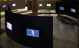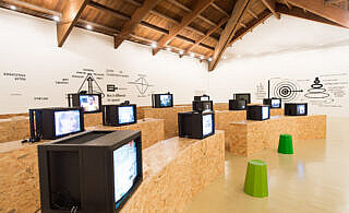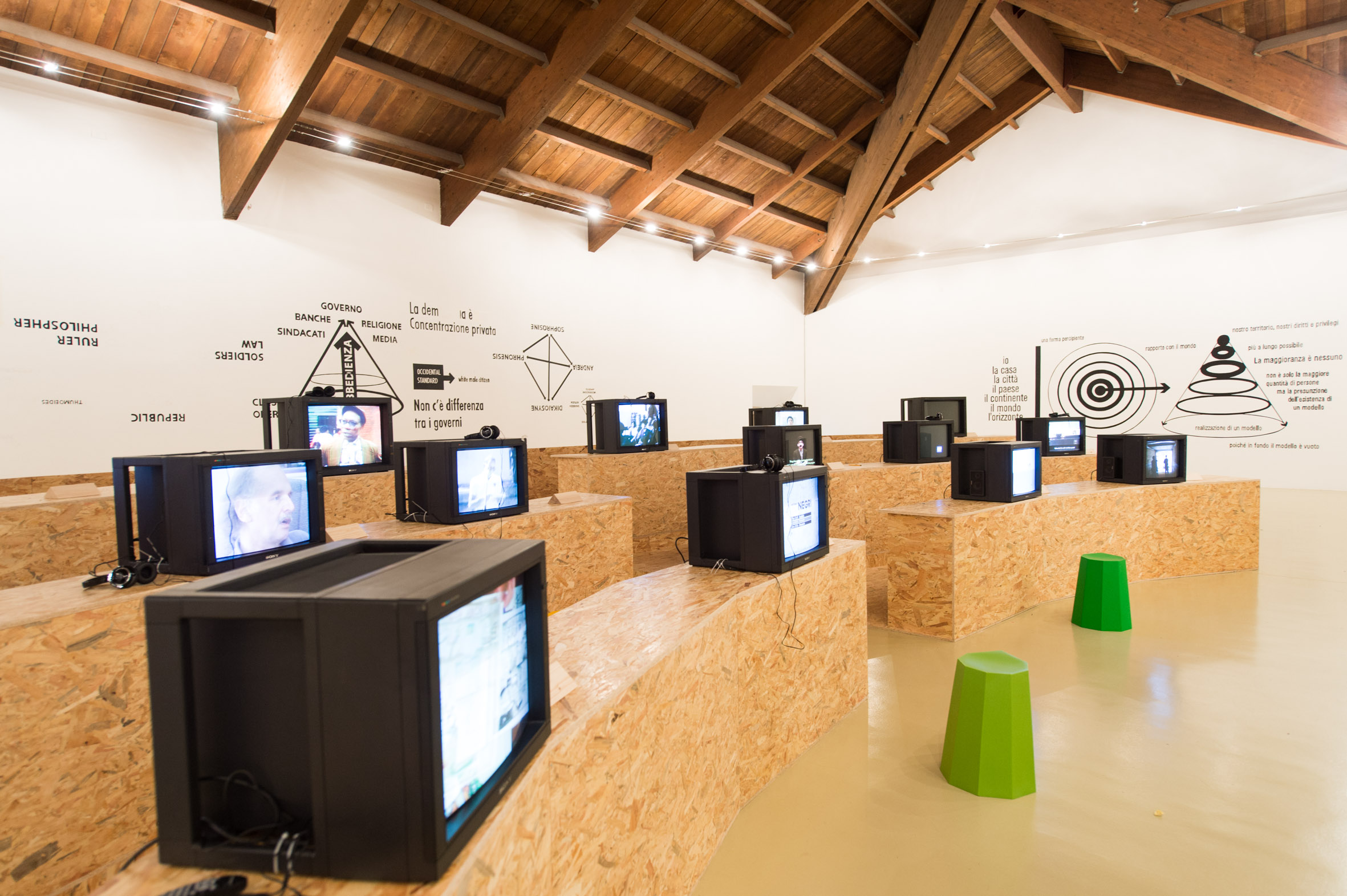 Disobedience Archive (The Republic), kustos Marco Scotini, Castello di Rivoli, Torino, 2013. postav Céline Condorelli i zidna slike Erick Beltrán